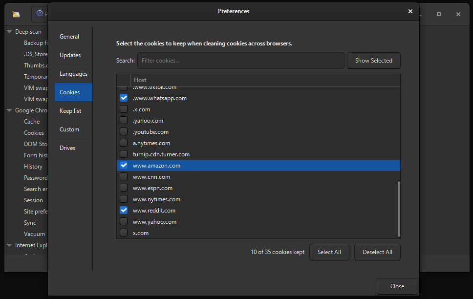 Select the cookies to keep when cleaning cookies across browsers.